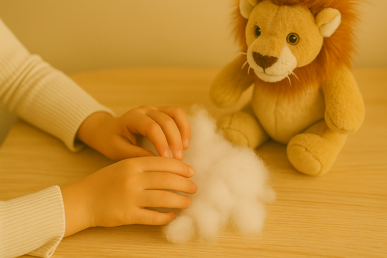 On remplit sa peluche Souhée avec un doux nuage de ouate que l'on effiloche bien au préalable, pour lui donner forme, moelleux et tendresse. Une étape simple, calme… et déjà très magique.